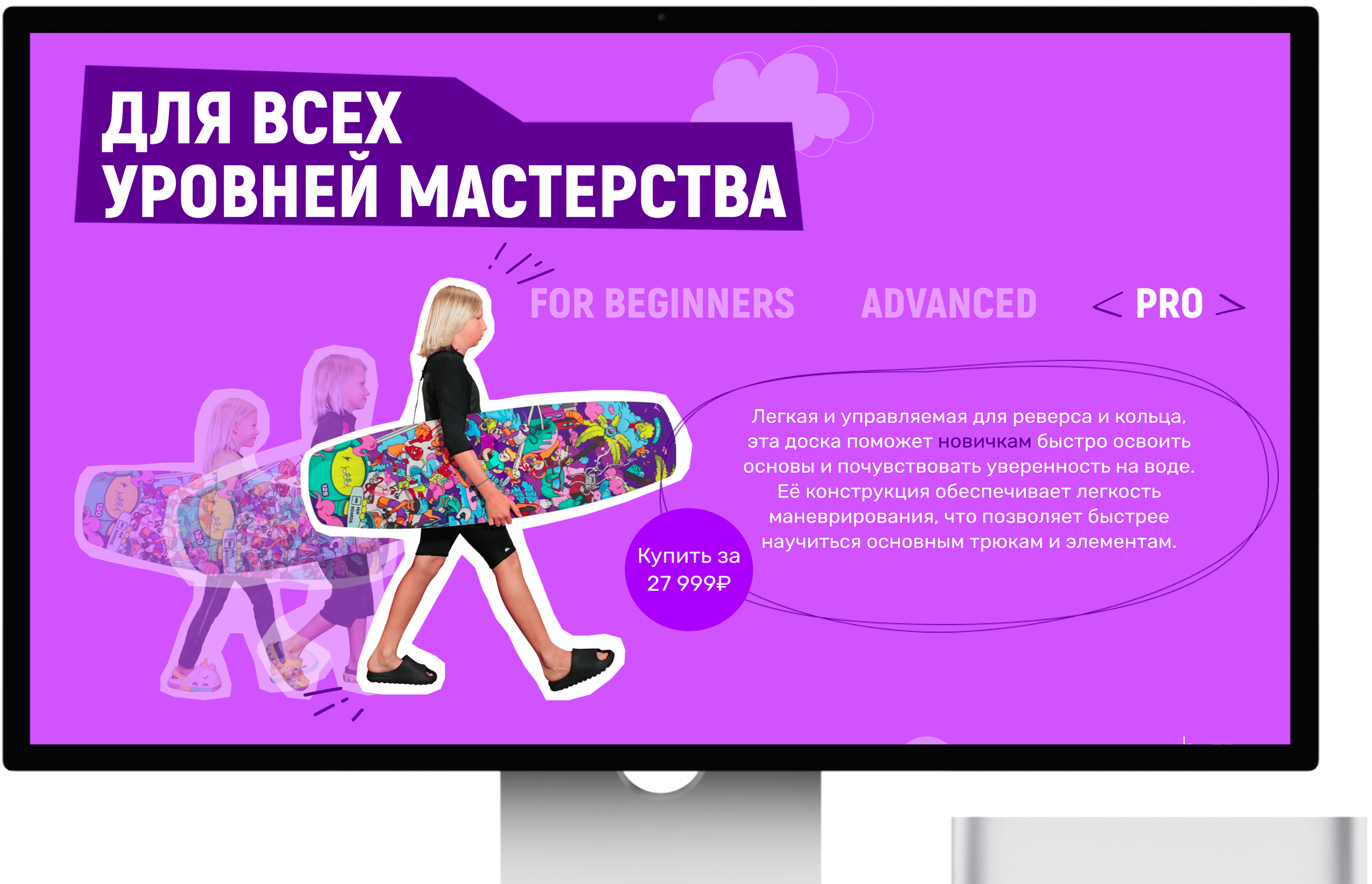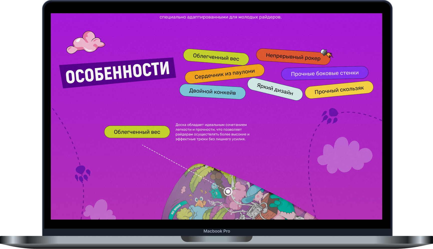 Наглядно показали, что доска подходит для любого уровня катания, проиллюстрировав блок графикой в стиле “эволюции”.