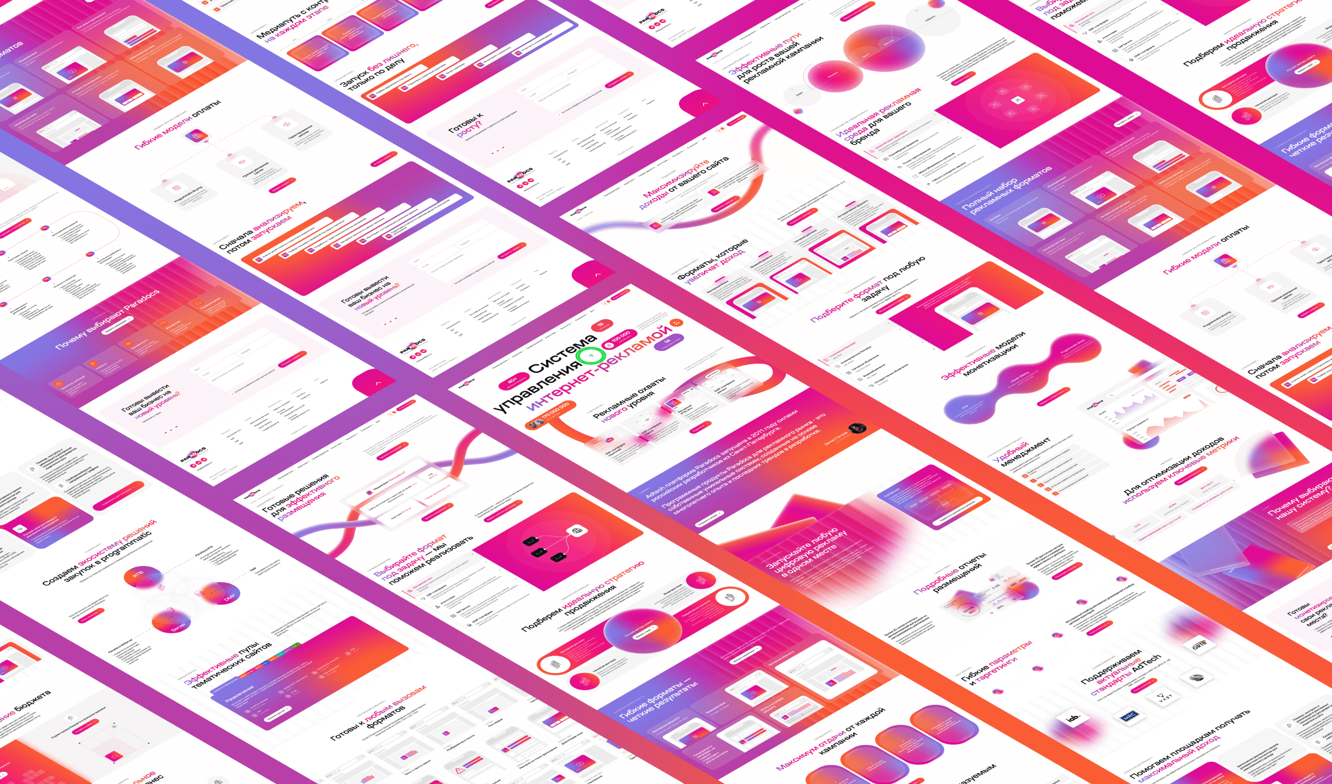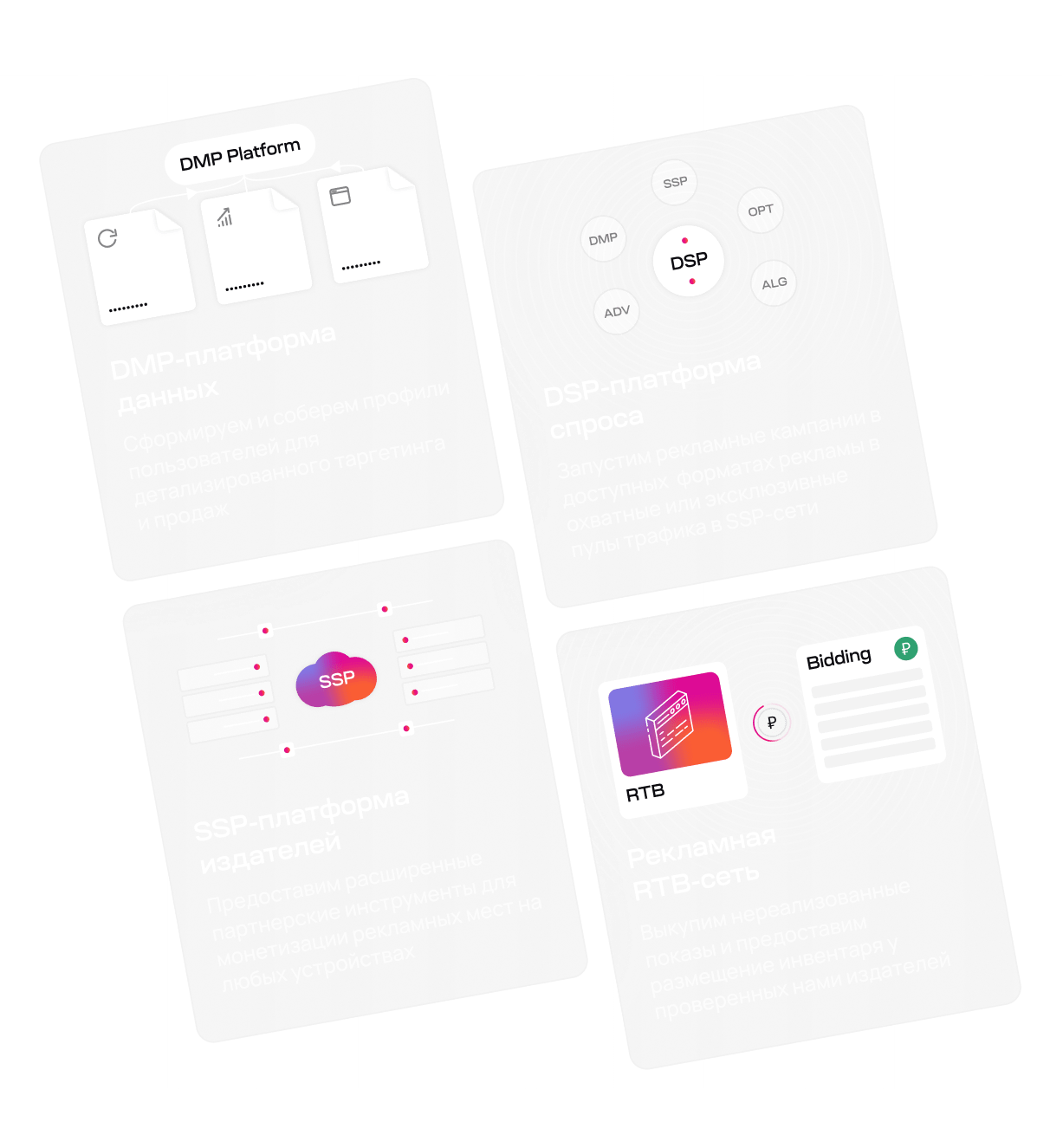 Чтобы сделать сложные термины (SSP, DSP, RTB) понятными, мы заменили технические схемы на простые иллюстрации-метафоры, выполненные в едином стиле. Структура на основе 12-колоночной сетки и ритмичное расположение блоков создают ясный и удобный для восприятия интерфейс.
