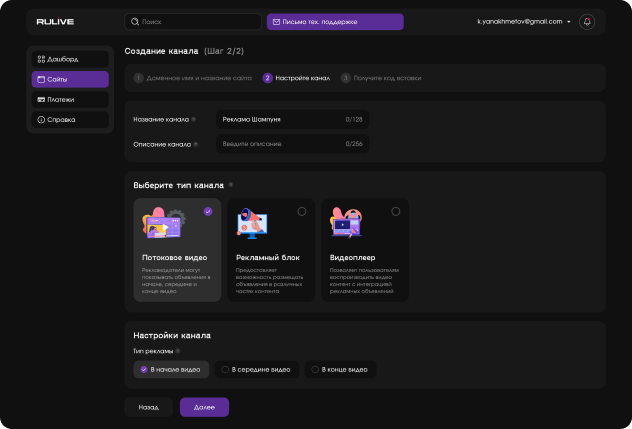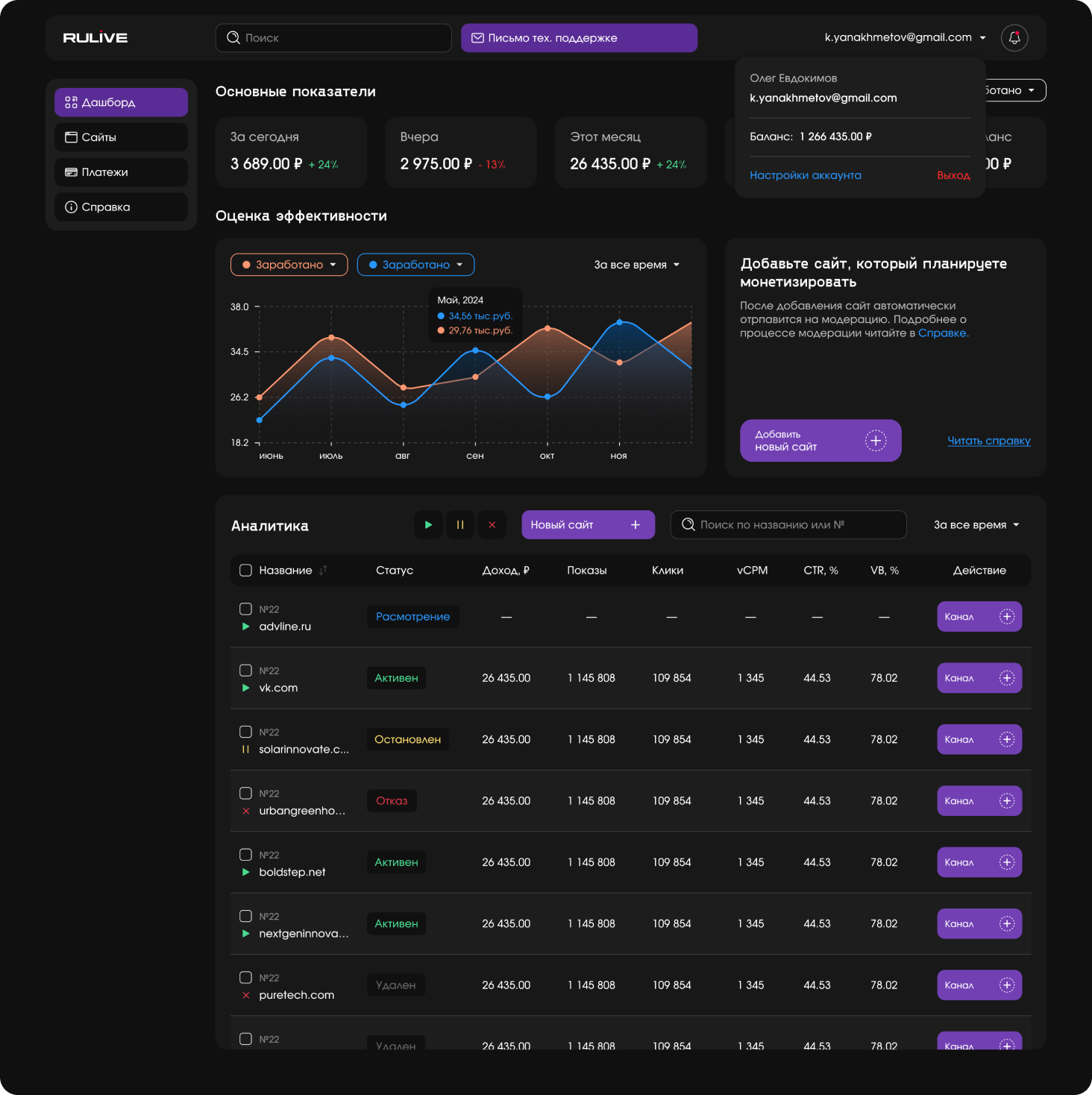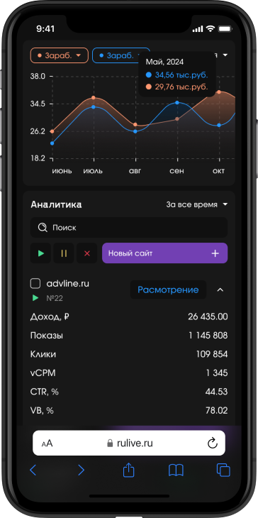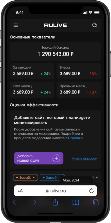 Личный кабинет позволяет управлять монетизацией, отслеживать доходы, получать статистику по разным показателям, а также дает доступ к гибкой настройке параметров.