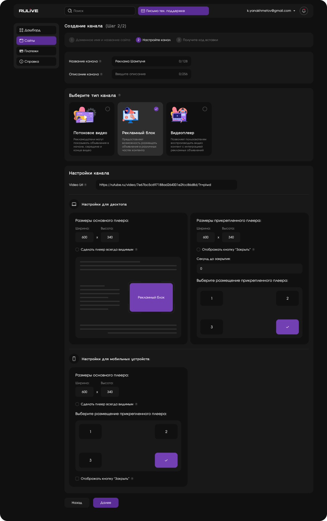 настройки канал: Рекламный блок