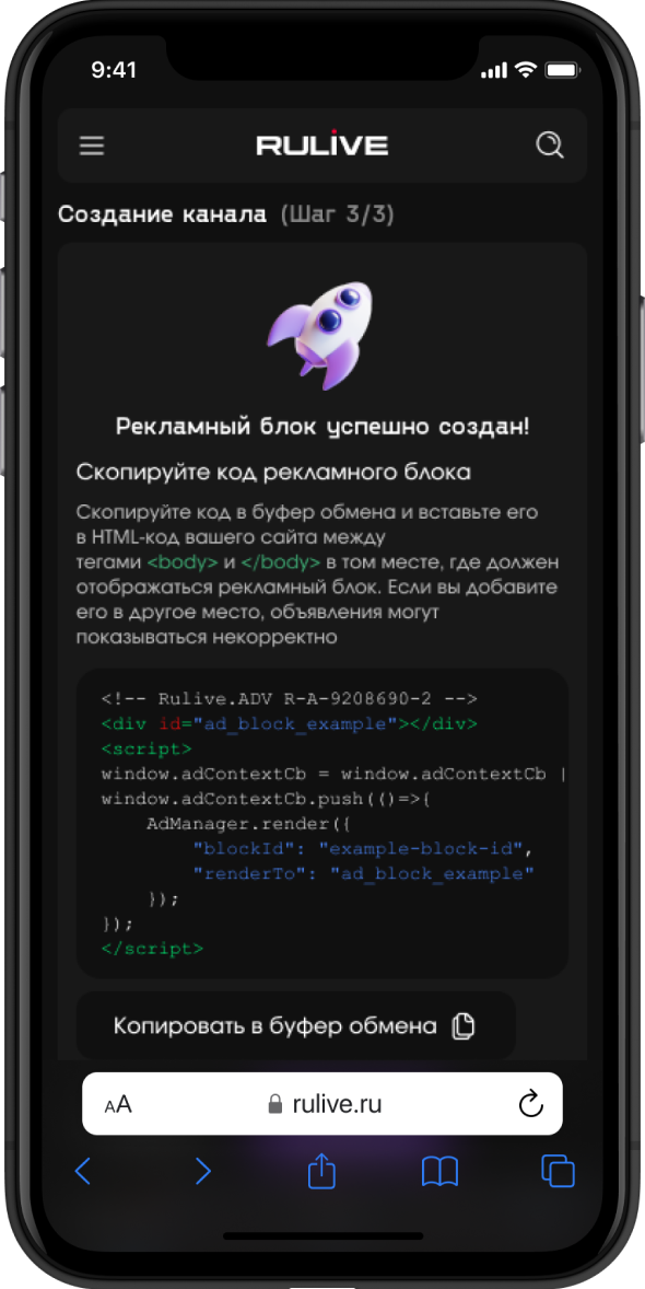 Запуск видеоконтента на площадках осуществляется с использованием JS-кода в сочетании с технологиями JS tags, iframe, API/XML Feeds, oRTB и direct links. Рекламные сервисы RULIVE работают на базе Paradocs AdServing и протоколов oRTB, включая DSP/SSP Service (datasvc, statsvc, fraudsvc, tracksvc и другие).